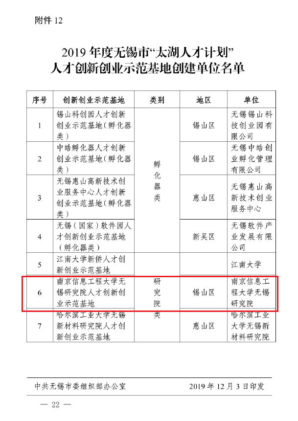 日前,中共无锡市委组织部公布了2019年度无锡市“太湖人才计划”人才创新创业示范基地创建单位,南京信息工程大学无锡研究院成功入选。